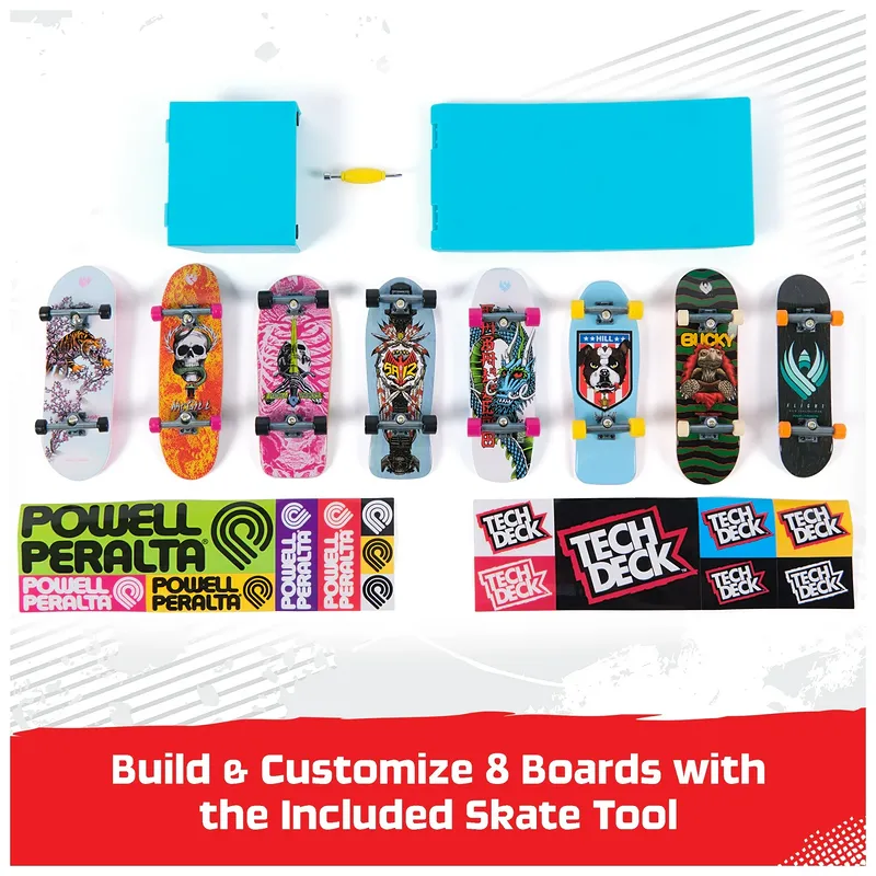- Personalize: build and personalize 8 complete mini skateboards as you like with boards, wheels, stickers, a skateboard tool and more